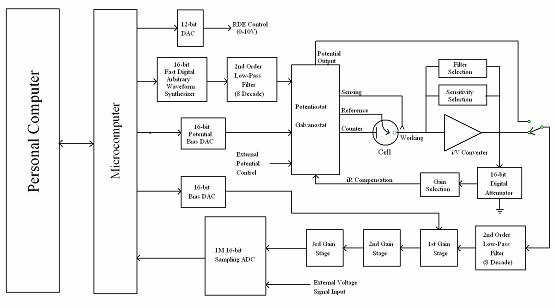 600E為通用電化學測量系統(tǒng)。下圖為儀器的硬件結(jié)構(gòu)示意圖。儀器內(nèi)含快速數(shù)字信號發(fā)生器,用于高頻交流阻抗測量的直接數(shù)字信號合成器,雙通道高速數(shù)據(jù)采集系統(tǒng),電位電流信號濾波器,多級信號增益,iR降補償電路,以及恒電位儀/恒電流儀(660E)。電位范圍為10V,電流范圍為250mA。電流測量下限低于10pA?芍苯佑糜诔㈦娚系姆(wěn)態(tài)電流測量。如果與 200B微電流放大器及屏蔽箱連接,可測量1pA或更低的電流。如果與