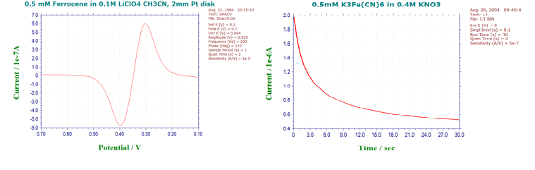 實驗參數(shù) CV和LSV掃描速度:0.000001V/s至10,000V/s 掃描時的電位增量:0.1mV(當掃速為1,000V/s時) CA和CC的脈沖寬度:0.0001至1000sec CA和CC的小采樣間隔:1s CC模擬積分器 DPV和NPV的脈沖寬度:0.001至10sec SWV頻率:1至100kHz i-t的小采樣間隔:1s ACV頻率范圍:0.1至10kHz SHACV頻率范圍:0.1至5kHz FTACV頻率范圍:0.1至50Hz,可同時獲取基波,二次諧波,三次諧波,四次諧波,五次諧波,六次諧波的ACV數(shù)據(jù) 交流阻抗:0.00001至1MHz 交流阻抗波形幅度:0.00001V至0.7V均方根值 其他特點 自動或手動iR降補償 電流測量偏置:滿量程,16位分辨,0.003%準確度 電位測量偏置:±10V,16位分辨,0.003%準確度 外部電位輸入 電位和電流的模擬輸出 可控電位濾波器的截止頻率:1.5MHz,150KHz,15KHz,1.5KHz,150Hz,15Hz,1.5Hz, 0.15Hz 可控信號濾波器的截止頻率:1.5MHz,150KHz,15KHz,1.5KHz,150Hz,15Hz,1.5Hz, 0.15Hz 旋轉(zhuǎn)電控制電壓輸出( 630E以上型號): 0-10V對用于0-10000rpm的轉(zhuǎn)速,16位分辨,0.003%準確度,需要某些旋轉(zhuǎn)電裝置才能工作 通過宏命令可以控制數(shù)字輸入輸出線 內(nèi)閃存儲器可迅速更新程序 串行口或USB口數(shù)據(jù)通訊 電解池控制:通氮,攪拌,敲擊(需要特殊電解池系統(tǒng)) CV數(shù)字模擬器和擬合器。用戶定義反應機理( 630E以上)或預定義反應機理(其他型號) 交流阻抗模擬器和擬合器(具有交流阻抗測量功能的型號) 大數(shù)據(jù)長度:256K-16384K可選 儀器尺寸: |