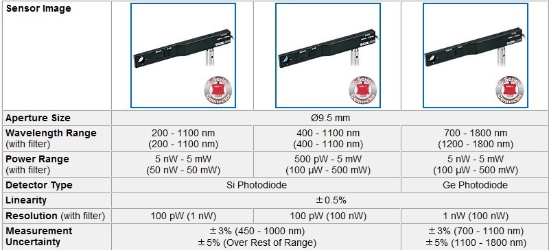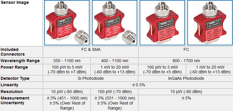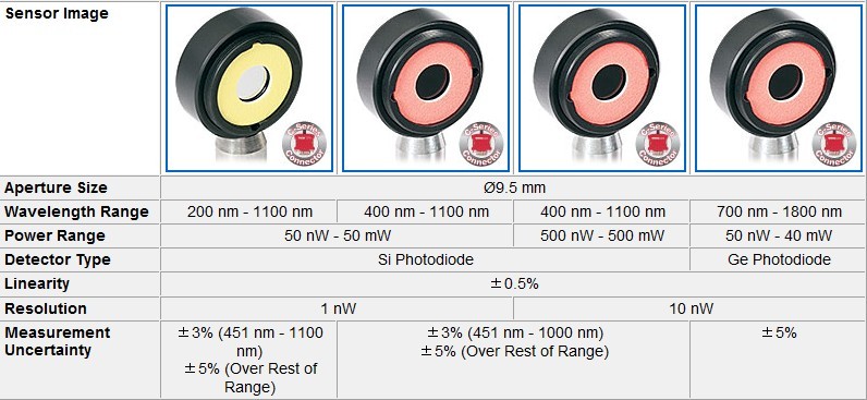 M520 幾乎與所有的功率和能量探頭相兼容(光電探頭,熱敏探頭,熱釋電探頭),應(yīng)用于從紫外到中紅外波段的檢測。它將光電探頭(超薄型, 積分球型, 光纖型)輸出電流從10 pA到5 mA間劃分了6個量程,對熱敏探頭的熱電電壓從100 nV到1 V劃分為4個量程,兩者都可自動或手動設(shè)置。表頭對熱釋電探頭的電壓從100 μV 到100V有4個手動可調(diào)量程,觸發(fā)電平可調(diào)節(jié),范圍從0.1%到99.9%。 用戶可以使用定制的探頭,并上傳一個響應(yīng)曲線來進(jìn)行光譜響應(yīng)校正。此外該表頭還配有一個USB2.0接口可用于遠(yuǎn)程連接控制。以下概述了所有兼容的探頭和適配器。