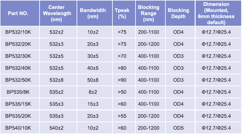 帶通濾光片波長(zhǎng)范圍:532nm-540nm