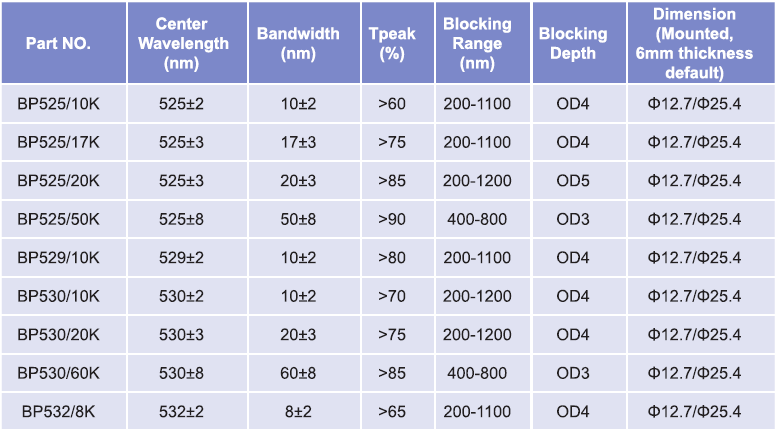 帶通濾光片波長(zhǎng)范圍:525nm-532nm