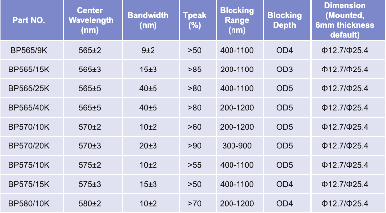 帶通濾光片波長(zhǎng)范圍:565nm-580nm