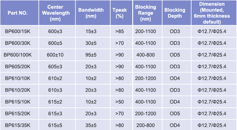 帶通濾光片波長(zhǎng)范圍:600nm-615nm