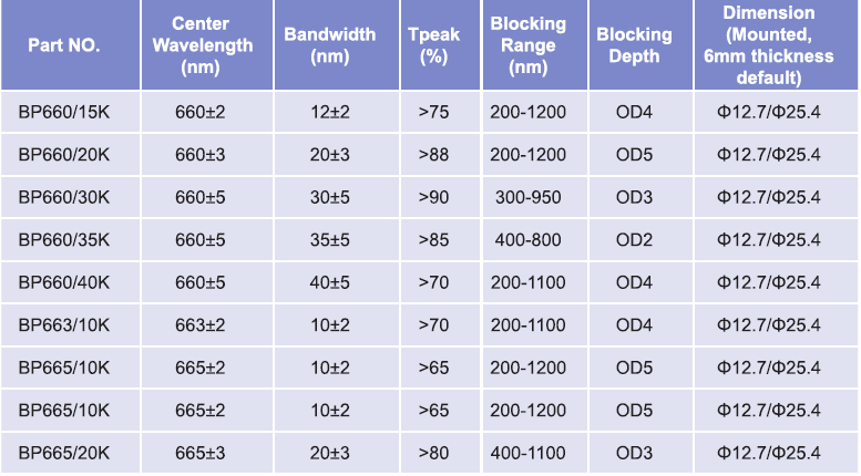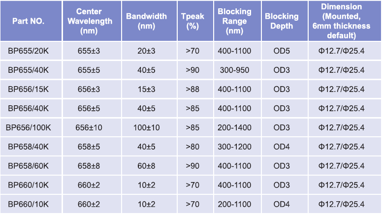 帶通濾光片波長(zhǎng)范圍:655nm-660nm