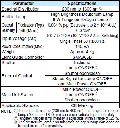 通過使用安裝在同一外殼內(nèi)的高亮度氘燈和鹵鎢燈,該光源能通過光波導(dǎo)(單賣)輸出200nm到1600nm的光。輸出的光強(qiáng)大約是現(xiàn)有型號(hào)的兩倍。緊湊的尺寸和較輕的重量使其易于攜帶。機(jī)械快門和外部控制等實(shí)用的功能使其易于使用。這種新型光源同時(shí)適用于多種型號(hào)的便攜式設(shè)備。