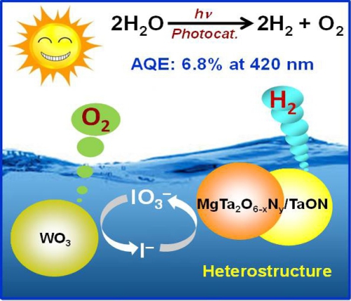 近日,中國科學(xué)院大連化學(xué)物理研究所催化基礎(chǔ)國家重點(diǎn)實(shí)驗(yàn)室及潔凈能源國家實(shí)驗(yàn)室太陽能研究部研究員、中科院院士李燦和研究員章福祥、陳閃山等與日本東京大學(xué)教授Kazunari Domen課題組合作,在可見光驅(qū)動(dòng)光催化Z機(jī)制完全分解水制氫研究中取得進(jìn)展。研究結(jié)果發(fā)現(xiàn),經(jīng)一步氮化合成的MgTa2O6−xNy/TaON異質(zhì)結(jié)材料(長可吸收波長達(dá)570 nm)可有效促進(jìn)光生電荷分離,基于此異質(zhì)結(jié)材料構(gòu)筑的寬光譜響應(yīng)Z機(jī)制完全分解水制氫體系,其表觀量子效率達(dá)到目前文獻(xiàn)報(bào)道高值(AQE: 6.8%@420 nm)。相關(guān)結(jié)果在線發(fā)表在《德國應(yīng)用化學(xué)》期刊上。