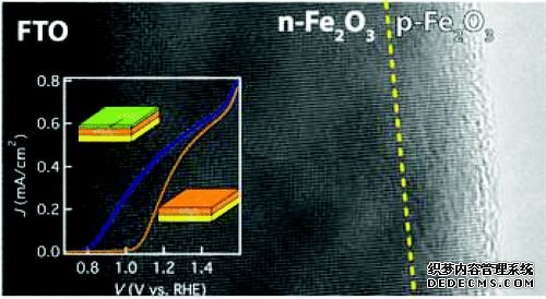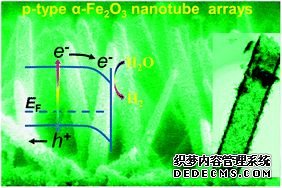 中科院理化所師文生課題組在具有ZnO陣列的FTO上,用電沉積的方式制備了FeOOH,通過(guò)高溫離子擴(kuò)散的方式使Zn2+摻雜入Fe2O3, 后去除ZnO模板獲得了p型Zn2+摻雜Fe2O3的空心納米管光陰,并展現(xiàn)出了較高的開啟電勢(shì)。(上圖,DOI:10.1039/C3CC40599K)