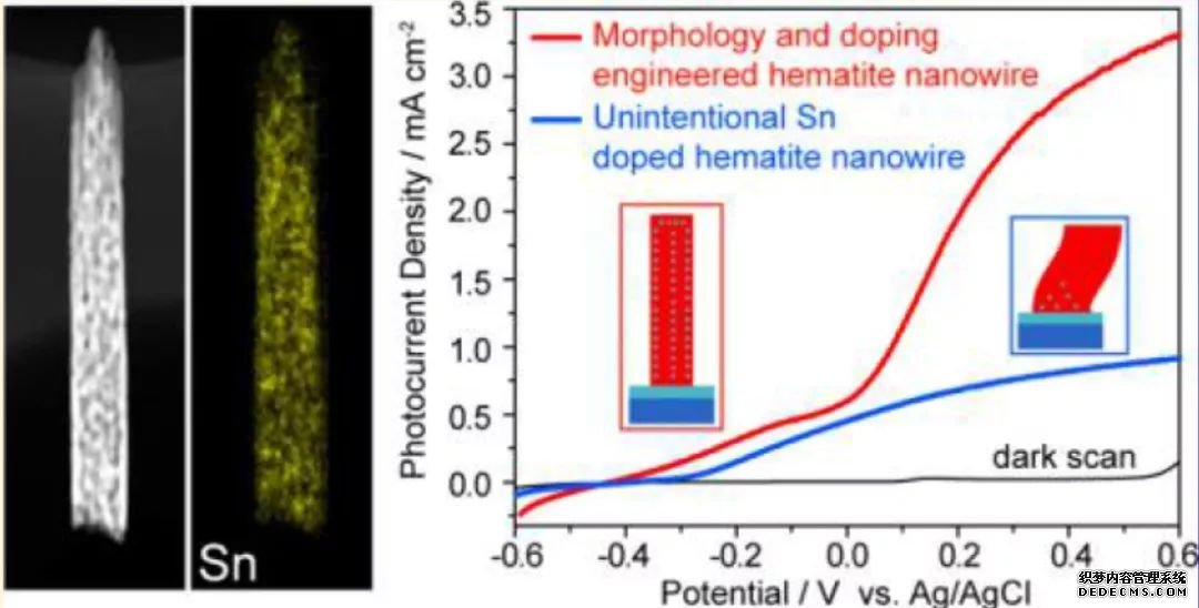 鄒志剛教授課題組通過(guò)水熱法制備了Ti4+摻雜的Fe2O3,并研究了Ti4+ 對(duì)Fe2O3結(jié)構(gòu)性能的影響。通過(guò)莫特肖特基譜,發(fā)現(xiàn)Ti4+摻雜對(duì)其帶邊位置沒(méi)有影響,但載流子濃度提升了1個(gè)量級(jí),這也是Ti4+摻雜能顯著提高Fe2O3光電流的主要原因。近年來(lái)除了Ti4+摻雜,Sn4+的摻雜也引起了廣泛的注意。(DOI:10.1039/C3CE26811J)