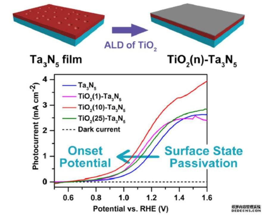 在對(duì)TiO2鈍化層的研究中,羅文俊課題組通過(guò)化學(xué)浴沉積的方法在Ta3N5上制備了一層TiO2,并且發(fā)現(xiàn)水溶液法制備的TiO2中含有的羥基基團(tuán)會(huì)影響電的性能。