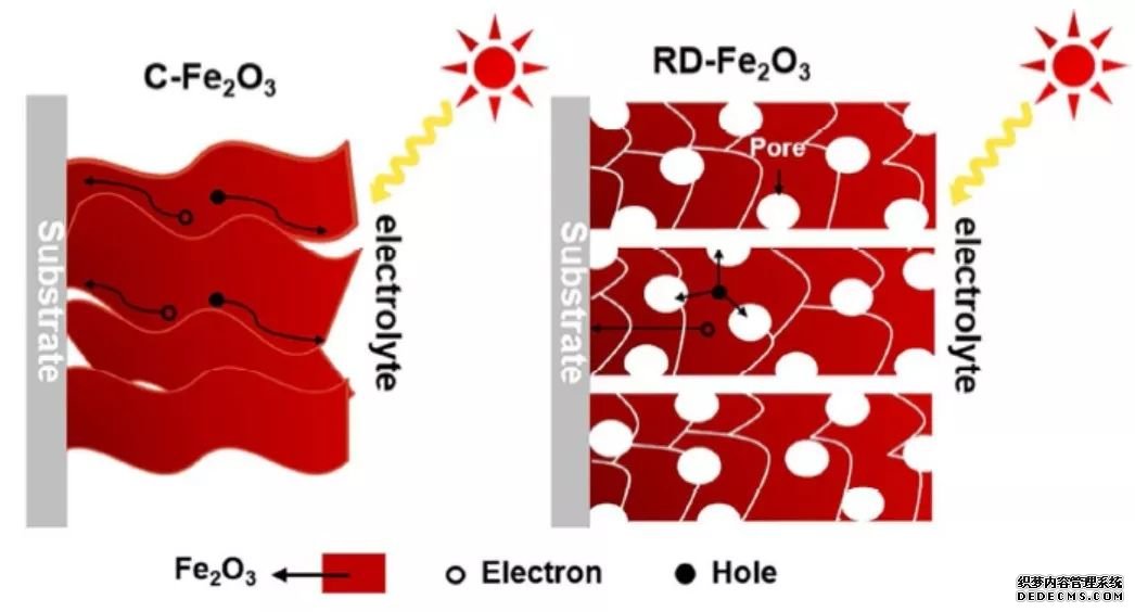 但是,F(xiàn)e2O3同時(shí)也存在著吸光系數(shù)差、光生空穴傳輸距離短(2~4 nm) 等限制因素,導(dǎo)致了目前基于Fe2O3光陽(yáng)的光電轉(zhuǎn)化效率依舊較低。由于Fe2O3的空穴傳輸距離太短,因此對(duì)Fe2O3的微納結(jié)構(gòu)調(diào)控顯得尤其重要。