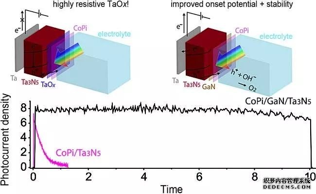 Kazunari Domen教授課題組在Angew發(fā)表的一篇文章中,通過(guò)在Ta3N5表面引入GaN 鈍化層,使原本 在1 h 時(shí)光電流就幾乎衰減為零的Ta3N5電的穩(wěn)定性提 高到了12 h 以上幾乎沒(méi)有太大衰減,并且其法拉第效率保持100%。(上圖,DOI:10.1002/anie.201700117)