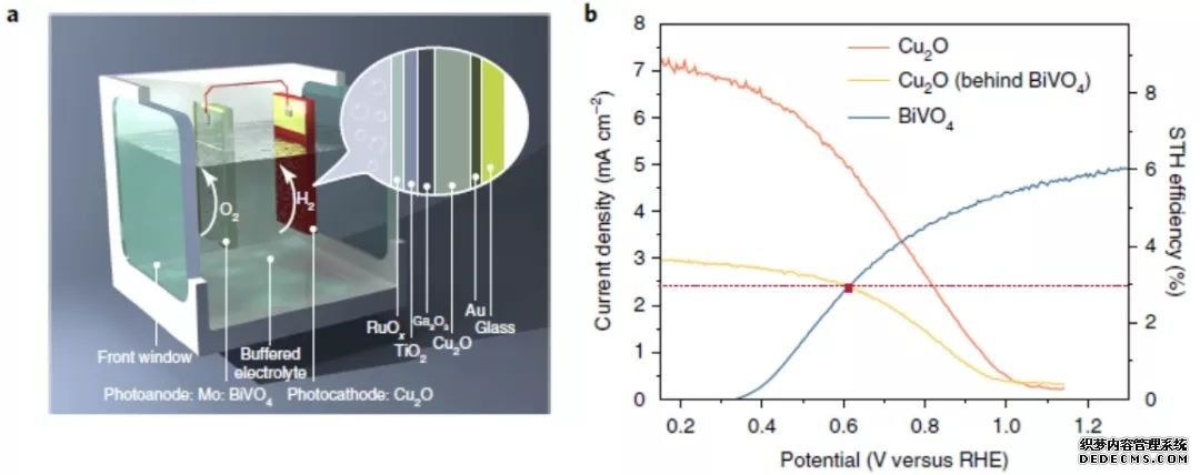 Michael Grätzel.課題組在Nature Catalysis的一篇工作中,利用Cu2O作為光陰,通過(guò)Ga2O3、TiO2、NiMo等多層結(jié)構(gòu)調(diào)控后,與BiVO4光陽(yáng)組成器件,終獲得了約3%的太陽(yáng)能轉(zhuǎn)化效率;(上圖,DOI:10.1038/s41929-018-0077-6)